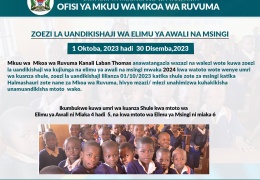 Mkuu wa Mkoa wa Ruvuma Kanali Laban Thomas anawatangazia wazazi wote kuanza kuwaandikisha watoto wao kwa ajili ya kujiunga elimu ya awali na msingi mwaka 2024...