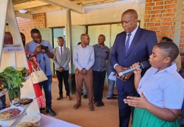 Pichani ni Mkuu wa Mkoa wa Ruvuma Kanali Laban Thomas akimsikiliza Mwanafunzi wa sekondari ya Songea Girls akitoa elimu ya lishe bora kwenye maadhimisho ya siku ya lishe mkoani Ruvuma .